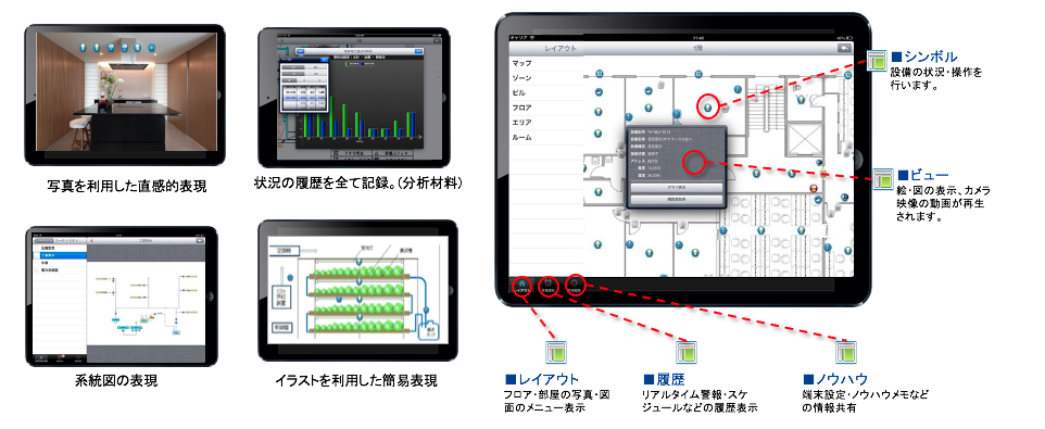 - 設備稼働状況表示機能:発停状況の可視化、運転履歴の記録
