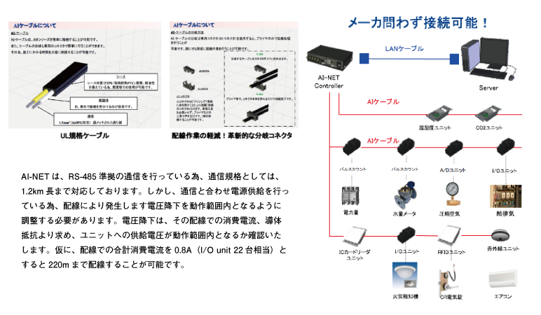 制御・監視対象の設備と中継装置(AINETコントローラ)を接続するだけ。無線接続タイプも登場。UL規格にも対応するケーブルを提供。市販CPEVにも対応。 - 多彩なデバイスユニット